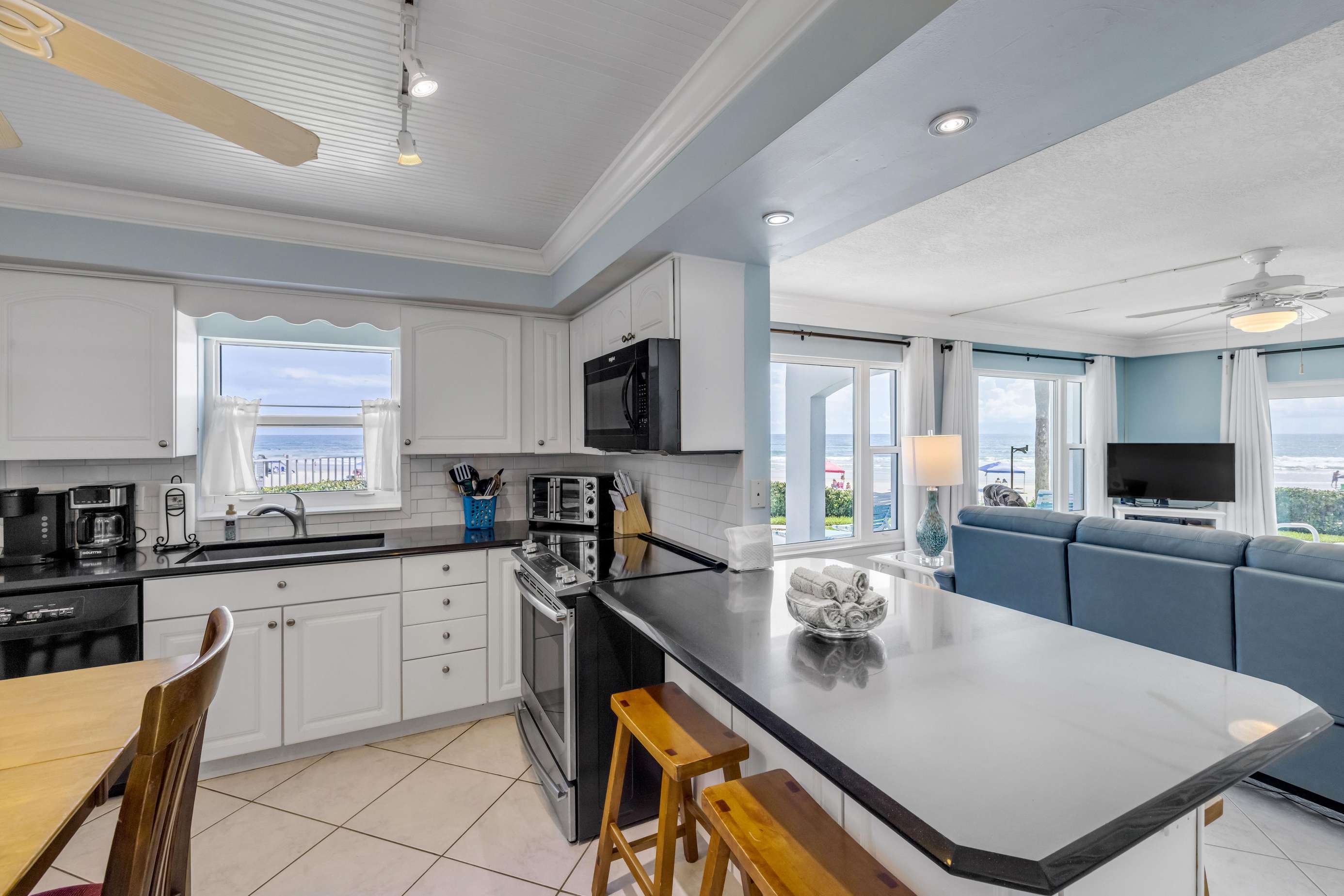 Each condo showcases an open living space designed for relaxation and comfort, complemented by tasteful furnishings and coastal charm. Step onto your private balcony to enjoy sweeping views of the Atlantic Ocean and tranquil bay, the perfect setting for morning coffee or evening sunsets.