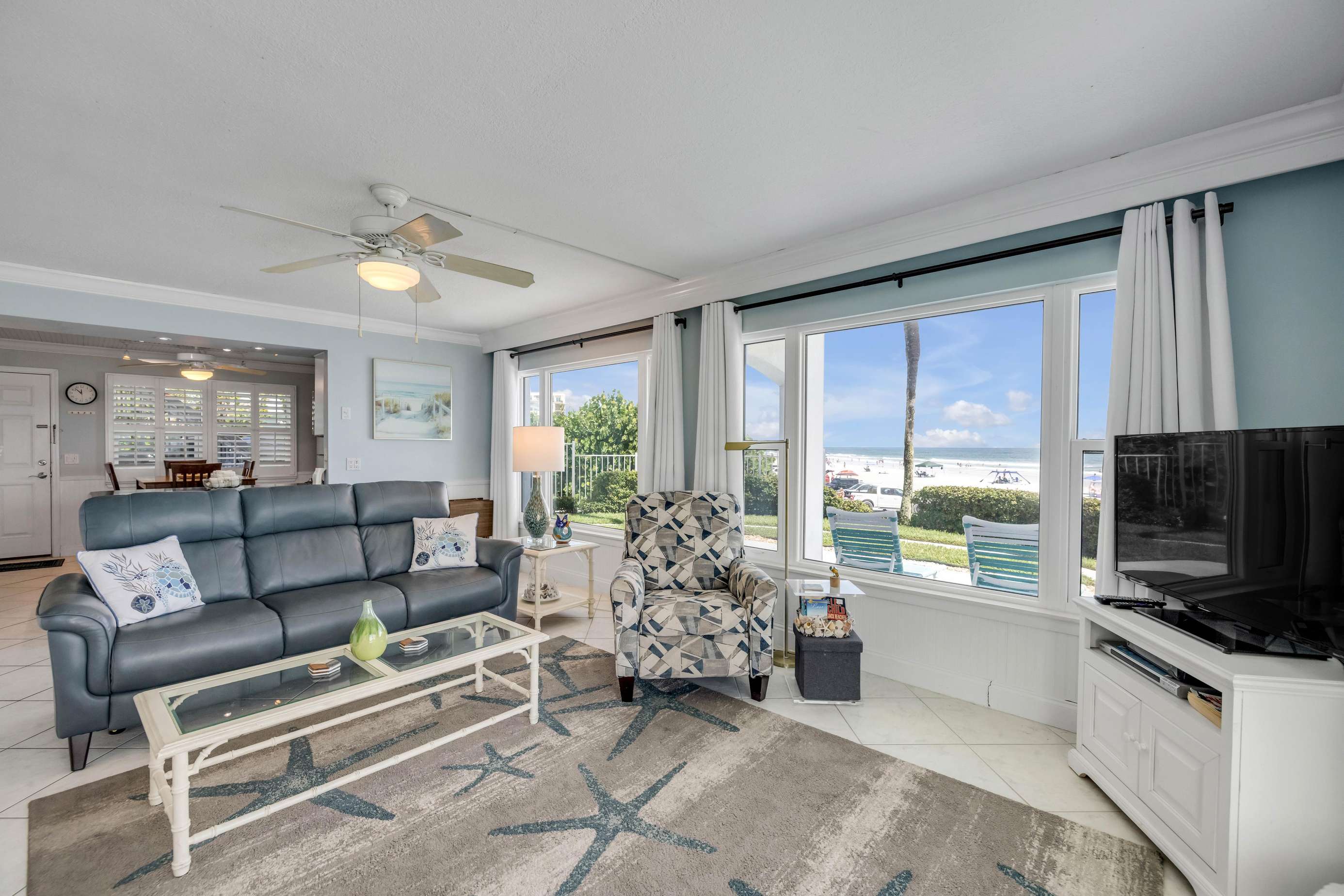 Inside, you’ll find a fully equipped kitchen with modern appliances—including a refrigerator, stove, microwave, and essential cookware—making dining in easy and enjoyable. The living and dining areas are inviting and well-appointed, featuring central air conditioning and heating, high-speed Wi-Fi, satellite TV, and ceiling fans for year-round comfort.